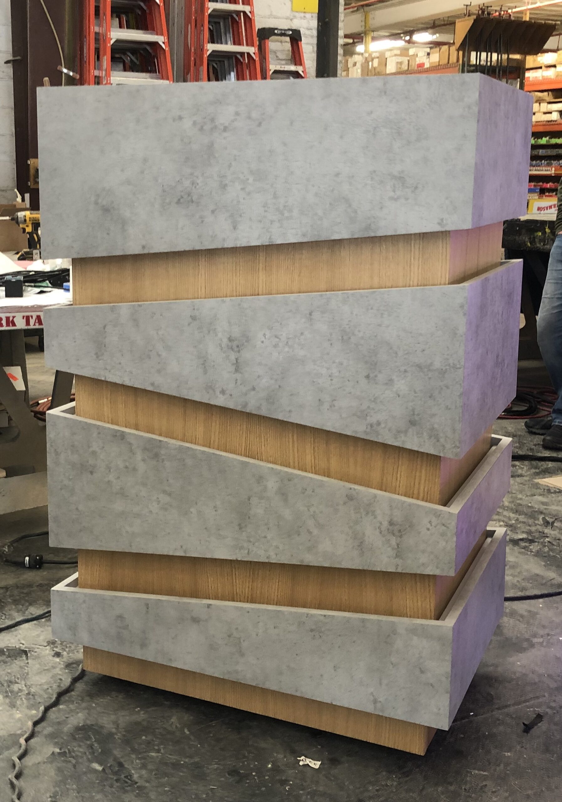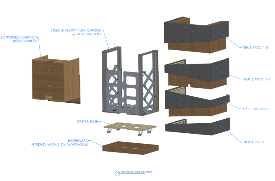 This project was a lectern for a Google theater. The lectern had automated height adjustment to allow for easy adjustment for different speakers. This project had a high level of embedded technology and very detailed mechanism to allow for easy operation. This project had wood, steel, electrical, automated mechanical drive system, high millwork finishes. I used designer info to determine best materials and build practices. Built by Mystic Scenic Studios