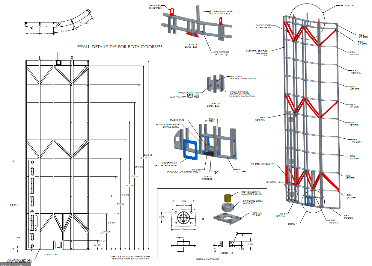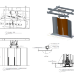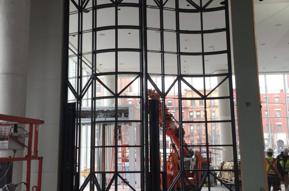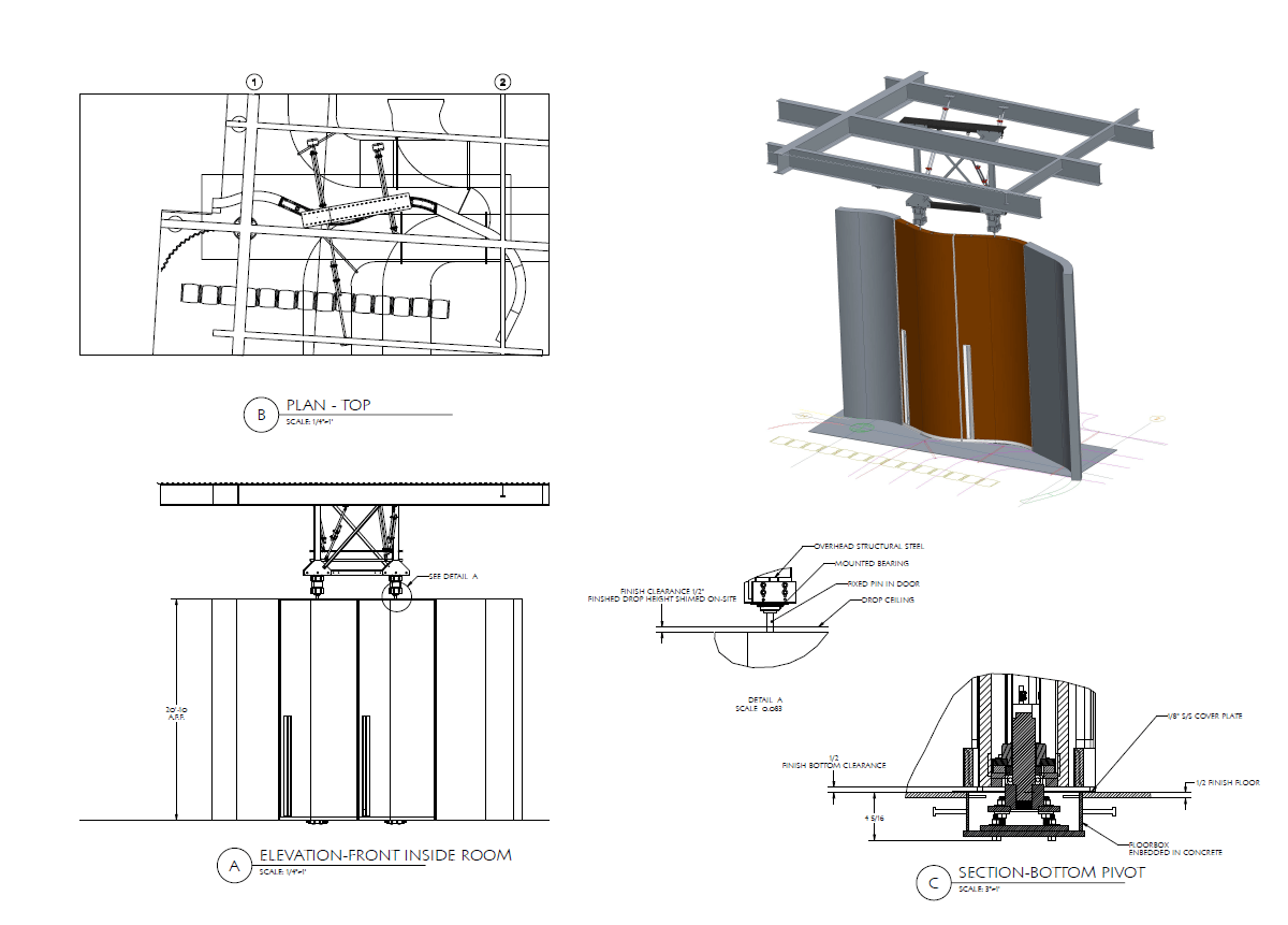 Built for a theater entrance at a Boston University theater, these doors stand over 20′ tall, have curved shape and pivot at center. Using welded steel frames, cnc cut steel plates and finished with fabric wrapped panels these doors operate with the push of a finger. The G.C. for the project was quoted saying “I don’t know who else could have built these doors”